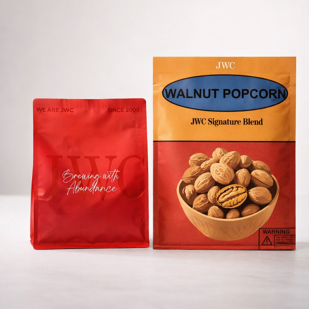 Our signature house blend Walnut Popcorn is constructed with the coffee beans from Brazil and Cambodia. This blend results in a nutty flavor with rich milk chocolate notes, a mild bitter aftertaste and no acidity and fruity.